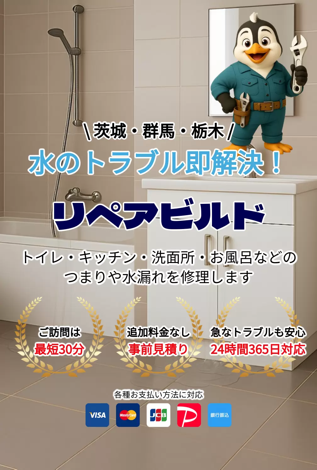 栃木県に本社を構える株式会社BUILDは、茨城・群馬・栃木の北関東エリアを中心に、水まわりのトラブルに迅速対応する修理・メンテナンスサービスを提供しています。トイレやキッチン、洗面所など、日常生活に欠かせない場所で起きる水漏れやつまりといったトラブルに対し、スピード感と丁寧な対応で安心と快適をお届けし、これまでに培ってきた豊富な現場経験と確かな技術力をもとに、どんなご依頼にも柔軟に対応し、北関東エリアにお住まいのみなさまの暮らしを、縁の下からしっかり支えてまいります。